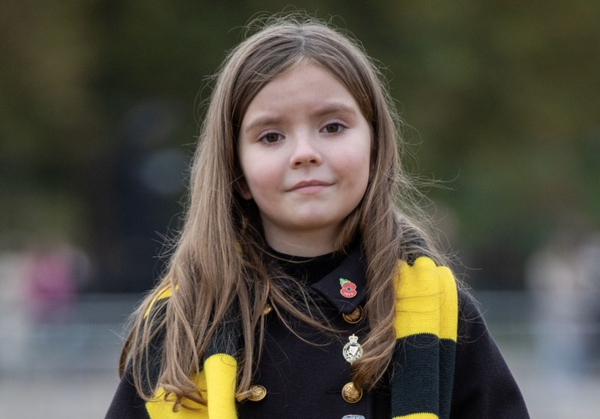 Isabelle wearing a bearskin cap at Remembrance