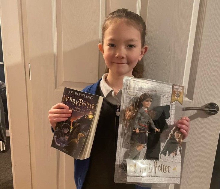 Elizabeth holding her Scotty's birthday presents