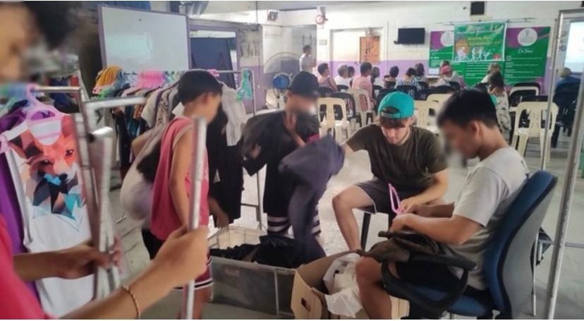 Josh sorting through clothes in the Philippines
