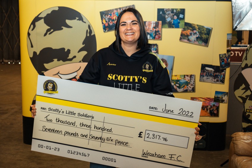 Scotty's founder, Nikki, with a cheque from Wroxham F.C.