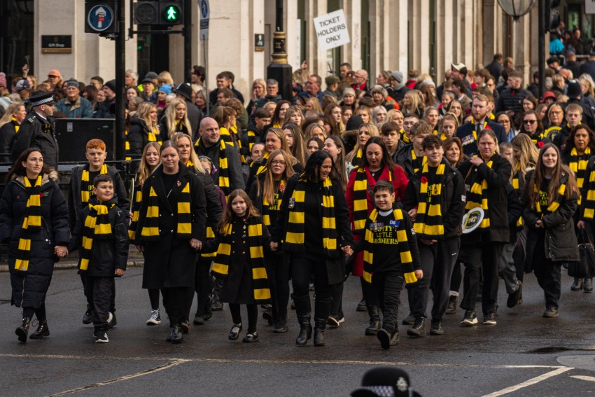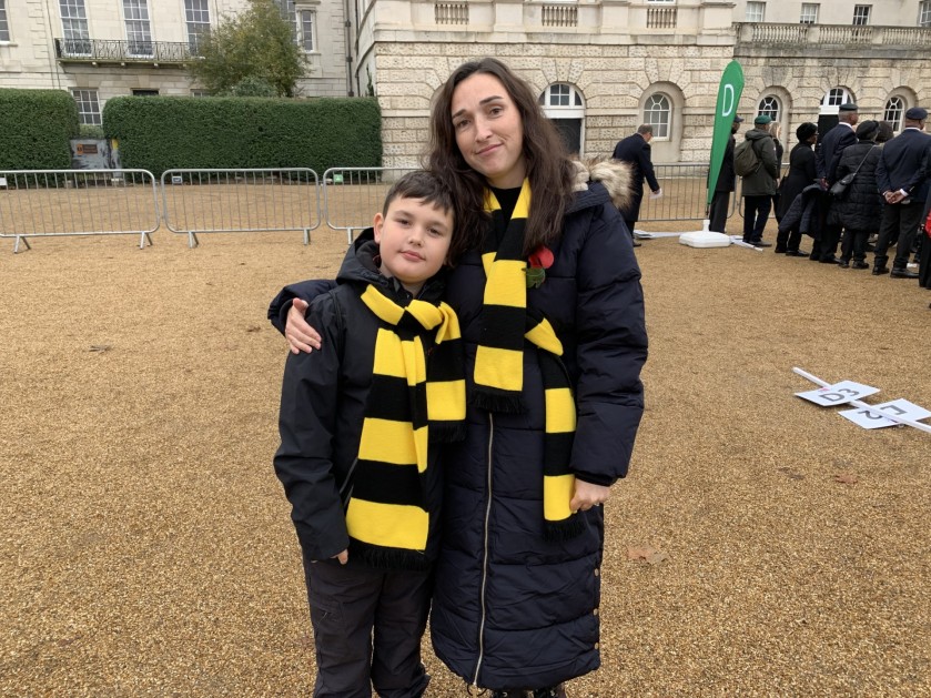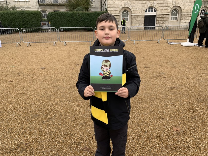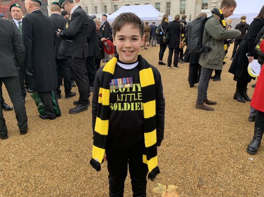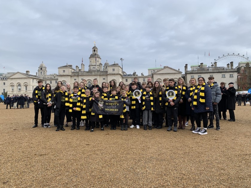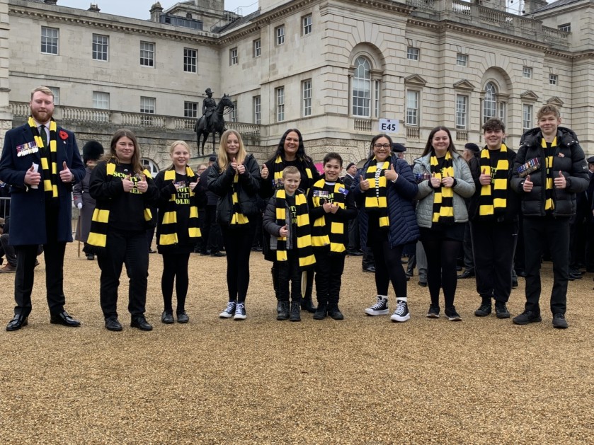 This Remembrance weekend, 46 members of Scotty’s Little Soldiers, the charity for bereaved British Armed Forces children and young people, met in London to march with pride in memory of their military parents. They wore their distinctive black and yellow Scotty’s scarves as they took part in the Royal British Legion Festival of Remembrance and marched past the Cenotaph at the National Service of Remembrance, honouring the lives of their heroes.