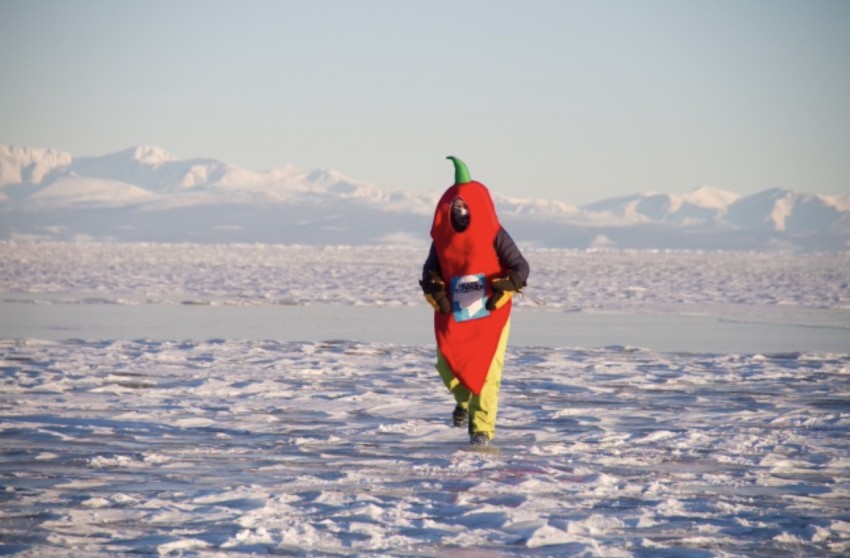 Sally, dressed as a chilli, running somewhere chilly