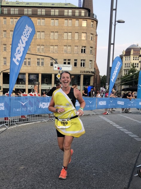 Sally, dressed as a lemon, completing the Hamburg Marathon