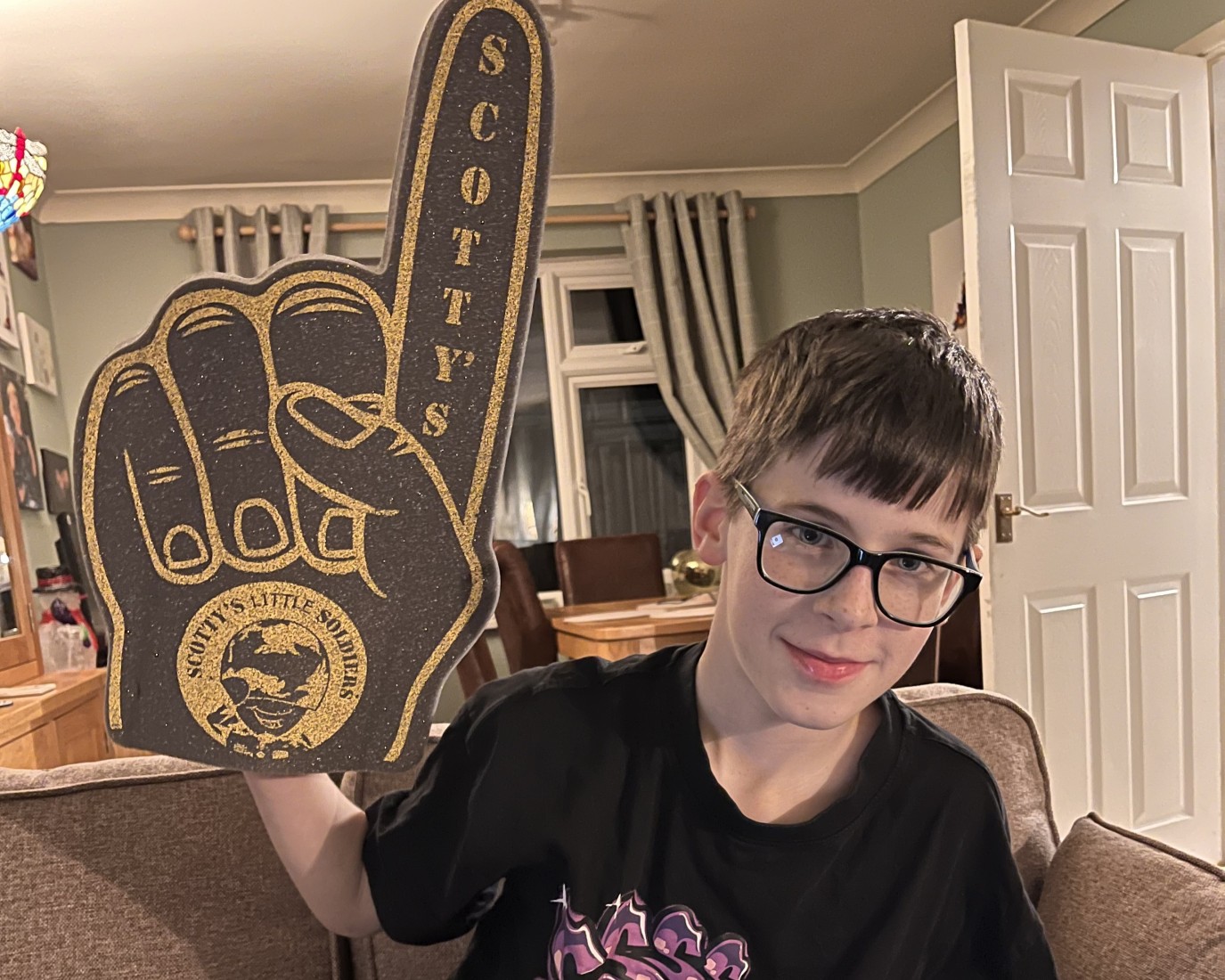 A Scotty Member joining in from home. Foam fingers were sent to members ahead of the virtual party.