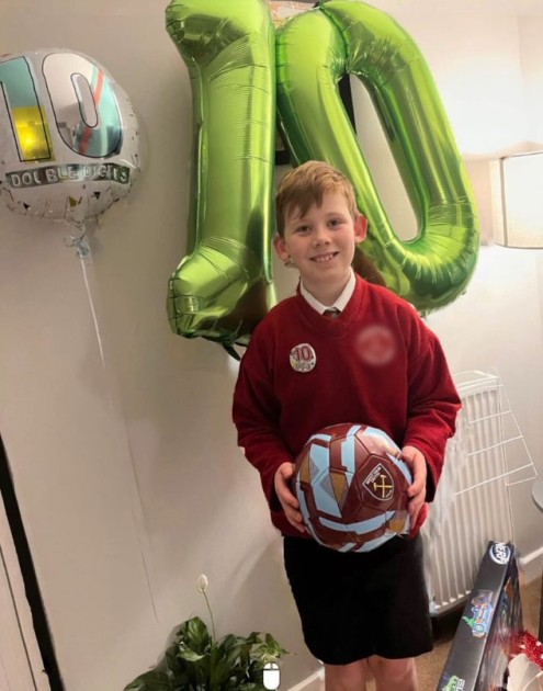 Harper holding a West Ham ball on his tenth birthday.